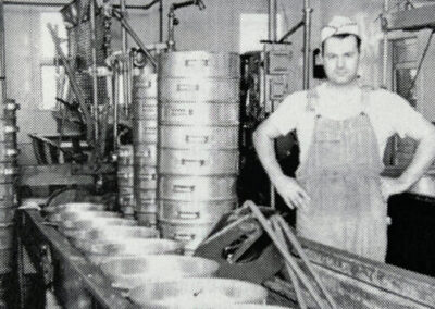 Jim’s day started with emptying out the cheese hoops at 5:00 a.m. followed with hand washing them. The hoops were then put back into the press to dry. After a quick breakfast at home (two doors down), Jim returned to drive truck to pick up milk from the local farmers. After returning, he placed the cans on the conveyor and dumped the milk into a round vat where it was weighed and a sample taken. A sample was taken every day but tested only every 15 days. Each day more sample milk was added to the sample bottle so it became a composite sample for the farmer. To keep milk this long, a chemical was added to keep it from the weighing vat, the milk was run into the pasteurizer. The milk was cooled down and then run into a large vat. A “starter” was then added. This starter was really sour milk taken from the previous day.