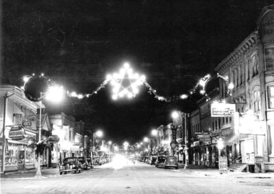 Christmas decorations are strung above street and the photo is so clear, you can see all the way down the block. Identified businesses – Murdock Hotel, Schauder’s Shoes, Elite Beauty Salon, Gallagher Drugs, Chaimson’s, and the Farmer’s Hardware.