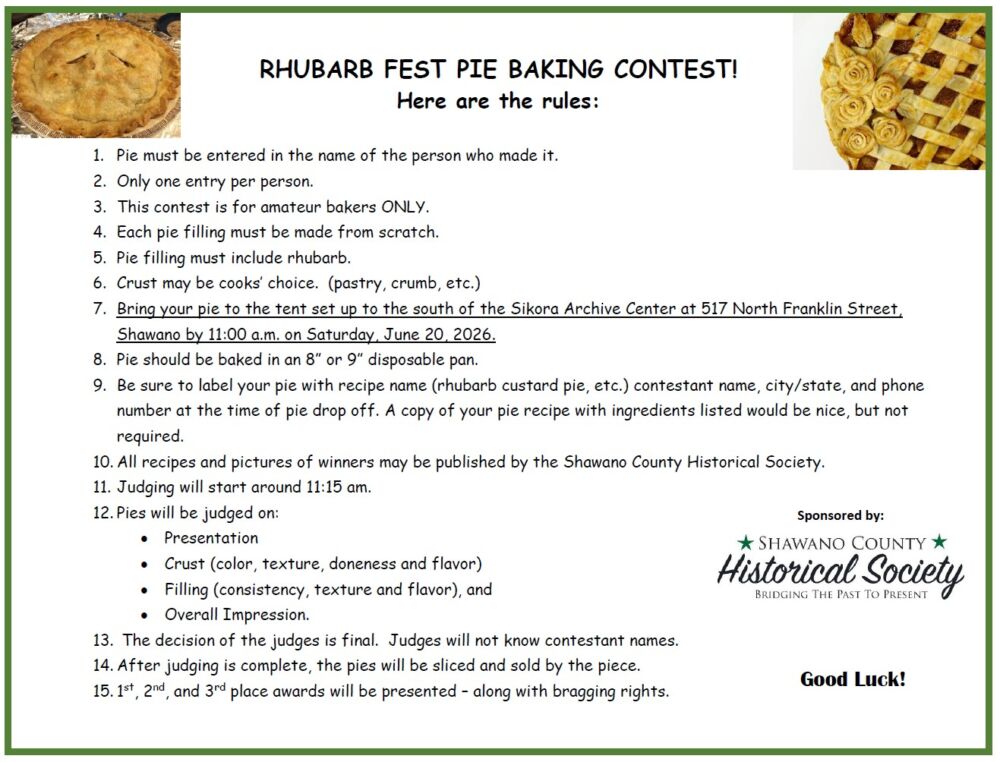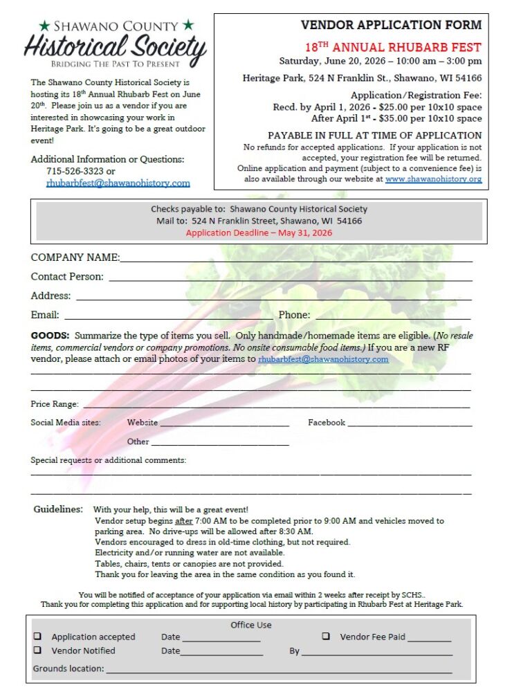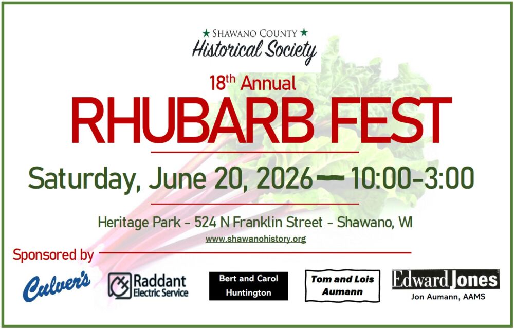 The Shawano County Historical Society is excited to host its 18th annual Rhubarb Fest on Saturday, June 20, 2026! Admission is free for the festival which will be held at Heritage Park, at 524 N Franklin Street in Shawano, from 10am to 3pm. Some of the features will include;