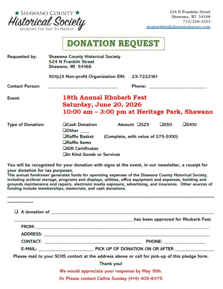 This annual fundraiser generates funds for operating expenses of the Shawano County Historical Society. Donations are an important part of a successful Rhubarb Fest. We appreciate cash donations to offset expenses, raffle baskets, gift certificates, and in-kind goods or services.