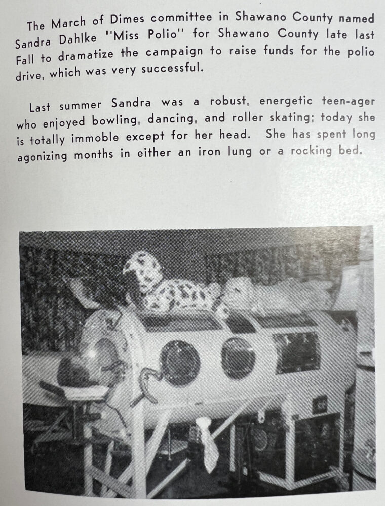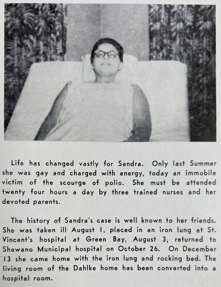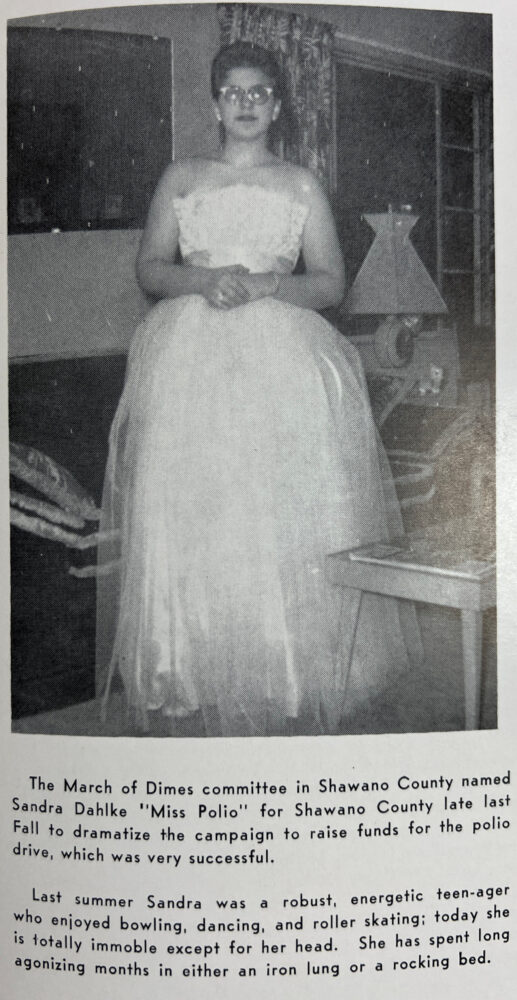 The former Shawano High School on Union Street, now the middle school, was completed for the 1955-56 school year. It’s the 70th anniversary of this important building so we were researching information for a upcoming post and came across information in a year book. The class of 1956 was the first class to graduate in the new Shawano High School on Union Street and in their year book is a dedication to Sandra Dahlke, who was named, “Miss Polio.”