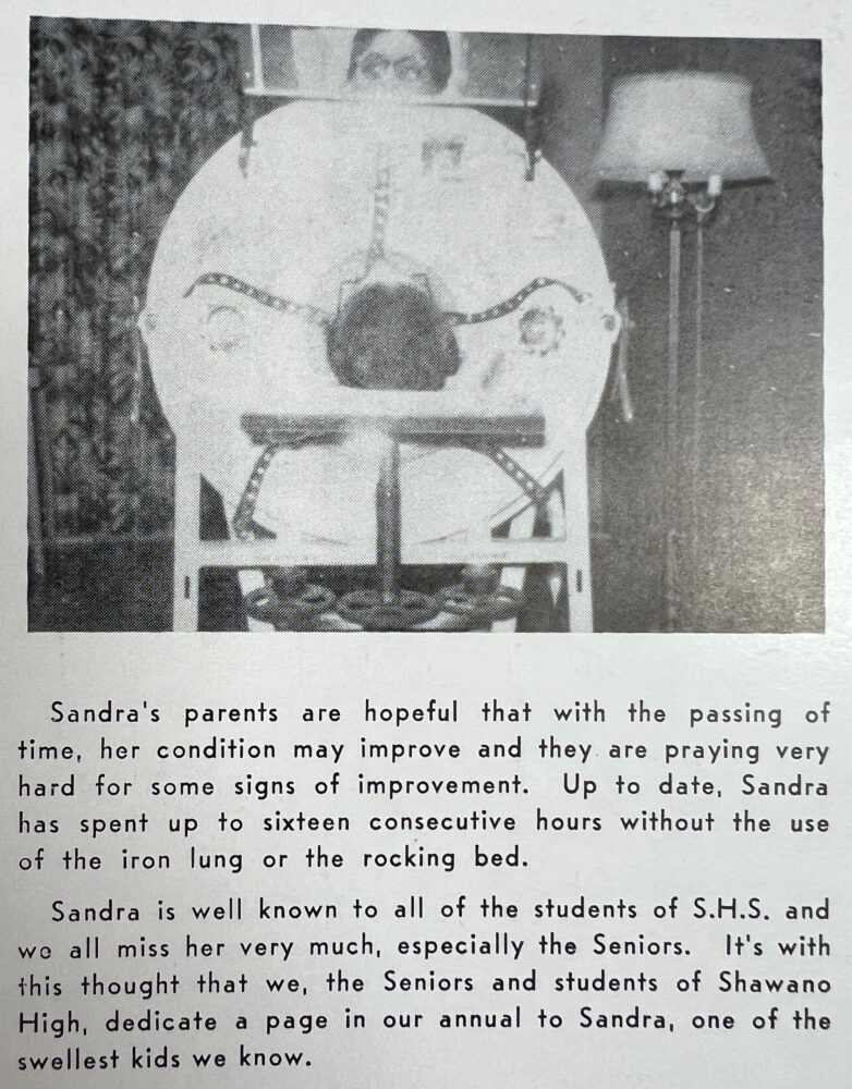In Sandra’s case, she was paralyzed from the neck down and spent months in an iron lung. We can’t imagine what this was like for Sandra, her family, or her graduating class.