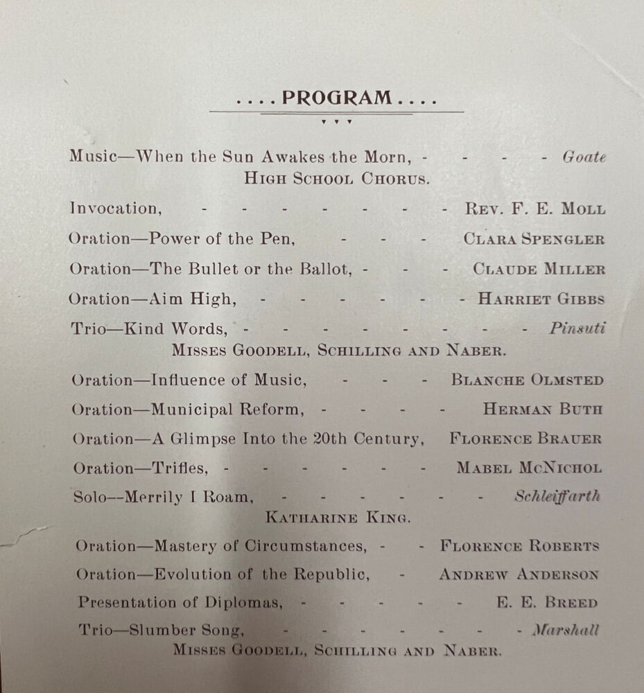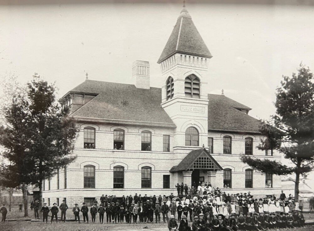 L.D. Roberts was chosen as the first principal of the district which included grades 1 – 12. The first high school class graduated in 1881. There were four graduates that year: Edward Farnsworth, George Martin, Clarence Mann, and Marietta Munn.