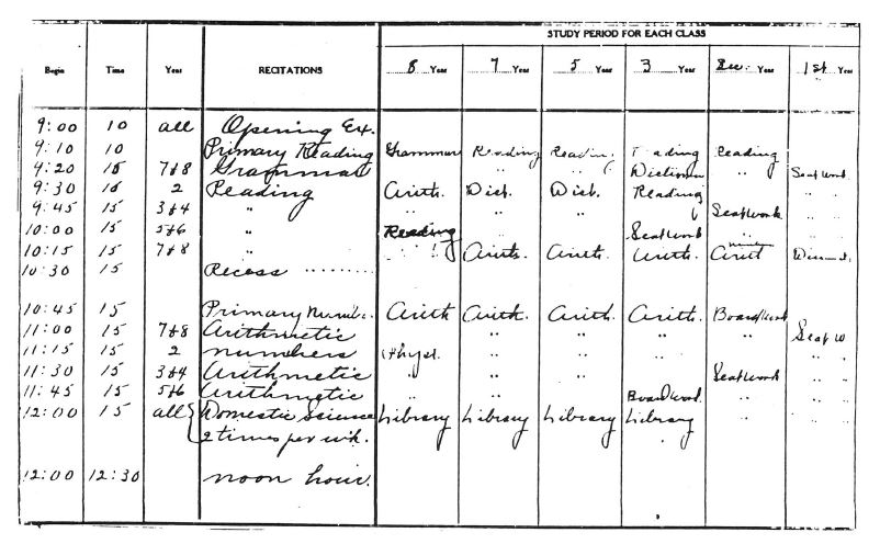 Classes were arranged in such a way that while the teacher was working with one group, the others had their own tasks to work on. Below is a typical schedule. This was taken from a grade book from Beversdorf School, 1917. This is the morning schedule. The afternoon was setup much the same way.