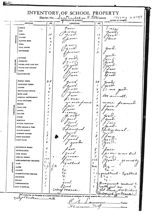 One of the biggest complaints of the teachers was a lack of materials. A list of a typical inventory is on the next page. The teachers were always quick to offer their own comments about what was needed in hopes the county superintendent would notice and make changes.