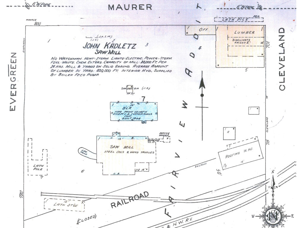 The John Kadletz Lumber Company is located at 820 E, Maurer Street, Shawano. The company consists of wholesale sawing of logs and retail lumber building service yard.